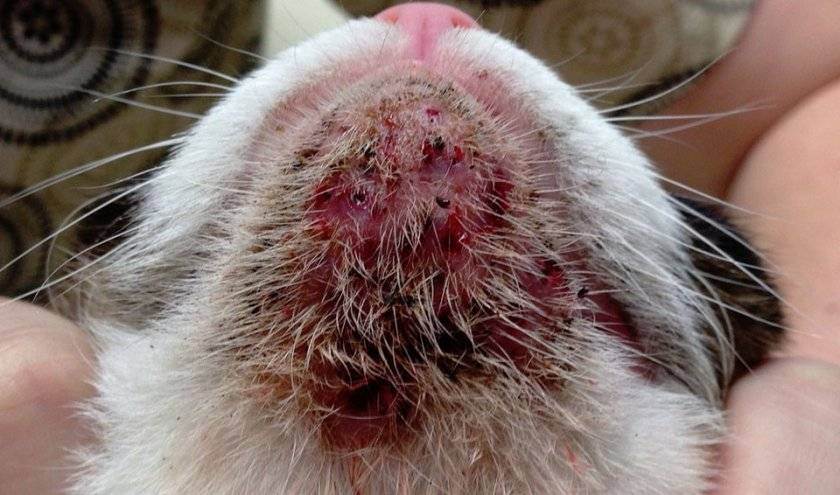 Чёрные точки вдруг могут появиться на мордочке кошки в области губ. Мордочка кажется словно сухой. Постепенно высыпания превращаются в гнойнички. Они вскоре лопнут, а на их месте станет заметна короста. Следующий симптом — выпадение шерсти с образованием на этом месте сухой воспалённой кожи.
