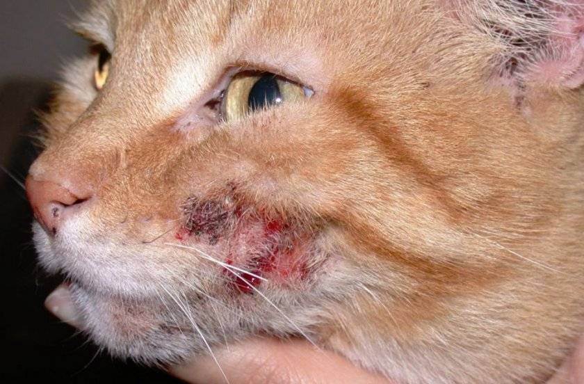 Кошка часто чешет подбородок, тем самым занося вторичную инфекцию и травмируя больное место.