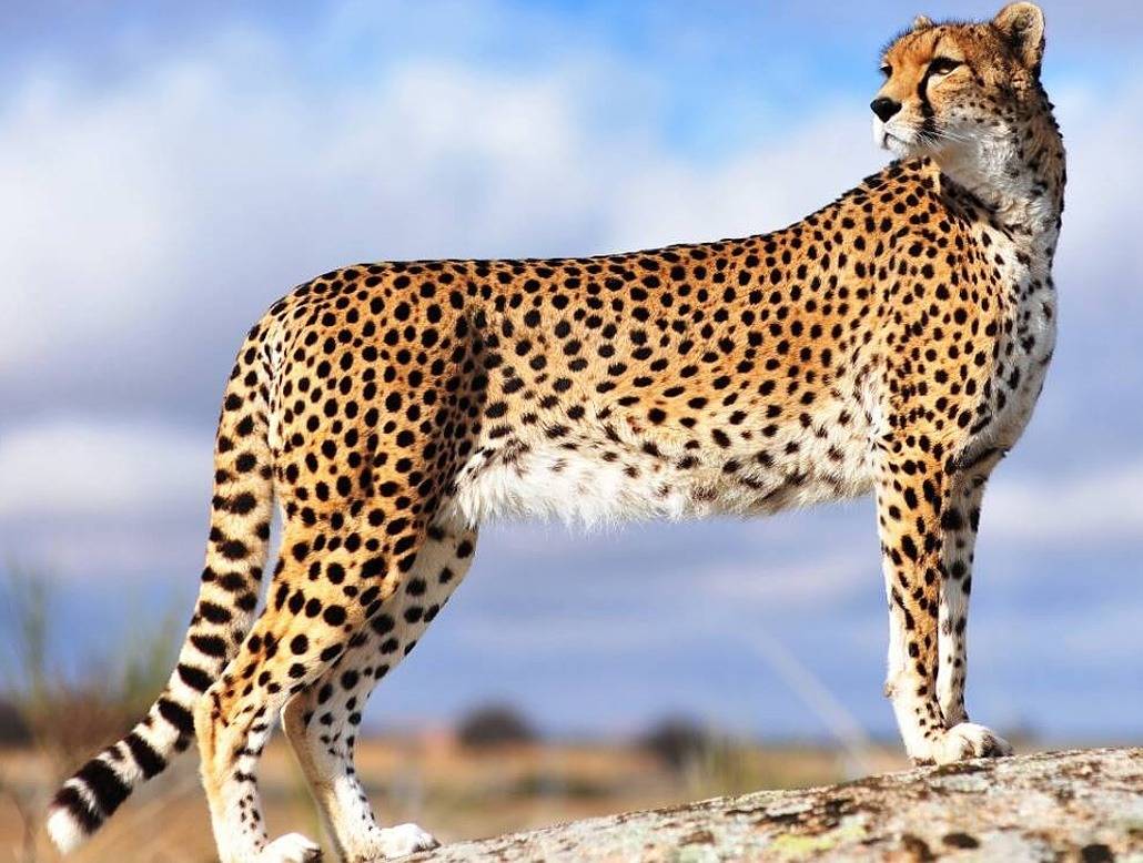 У гепарда худые длинные лапы и небольшой череп – за такие черты представителя относят к подвиду малых кошек. Однако масса животного составляет внушительные ~65 кг, что говорит о крупной породе. Это млекопитающее обладает хорошей гибкостью и высокой скоростью бега – его называют самым быстрым животным в мире. Длина тела – 115~140 см, рост – 75~90 см.
