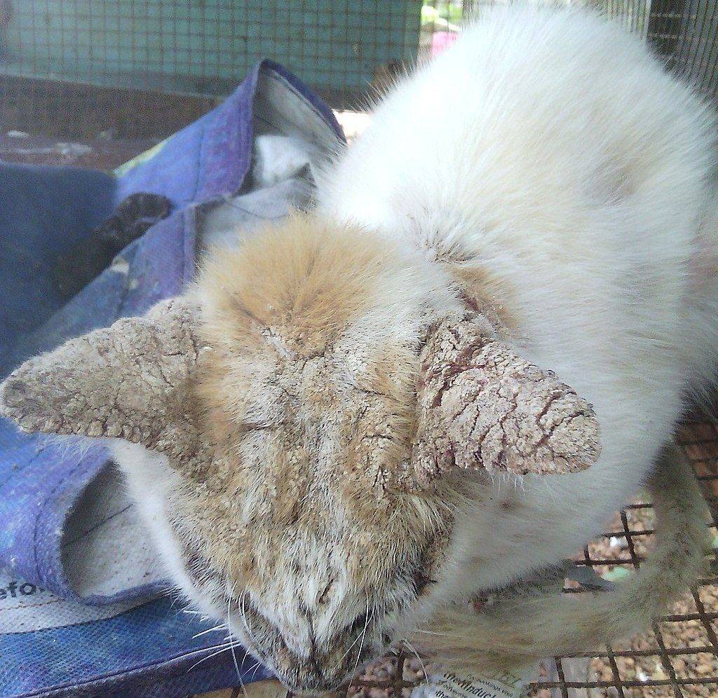 - с увеличением тяжести зудневой чесотки грубеет и утолщается кожа, могут образовываться складки, трещины, сочиться кровь и лимфа из образовавшихся трещин и ран, в которые с легкостью попадает патогенная микрофлора, вызывая вторичное заражение, например, стафилококками: вторичная инфекция усугубляет положение заболевшего кота гнойными образованиями или даже некрозом.