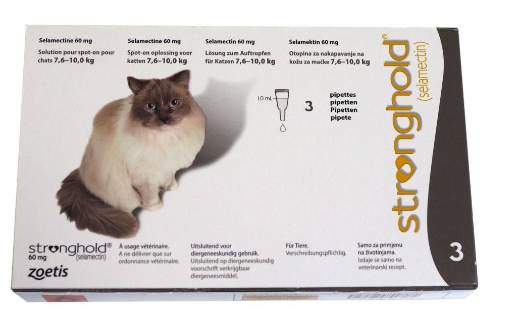 - Стронгхолд. Паралич и гибель паразитов вызывает основное действующее вещество препарата — селамектин. Средство наносится непосредственно на кожу в зоне холки. Достаточно одноразового применения. Ориентировочная стоимость — от 285 рублей.
