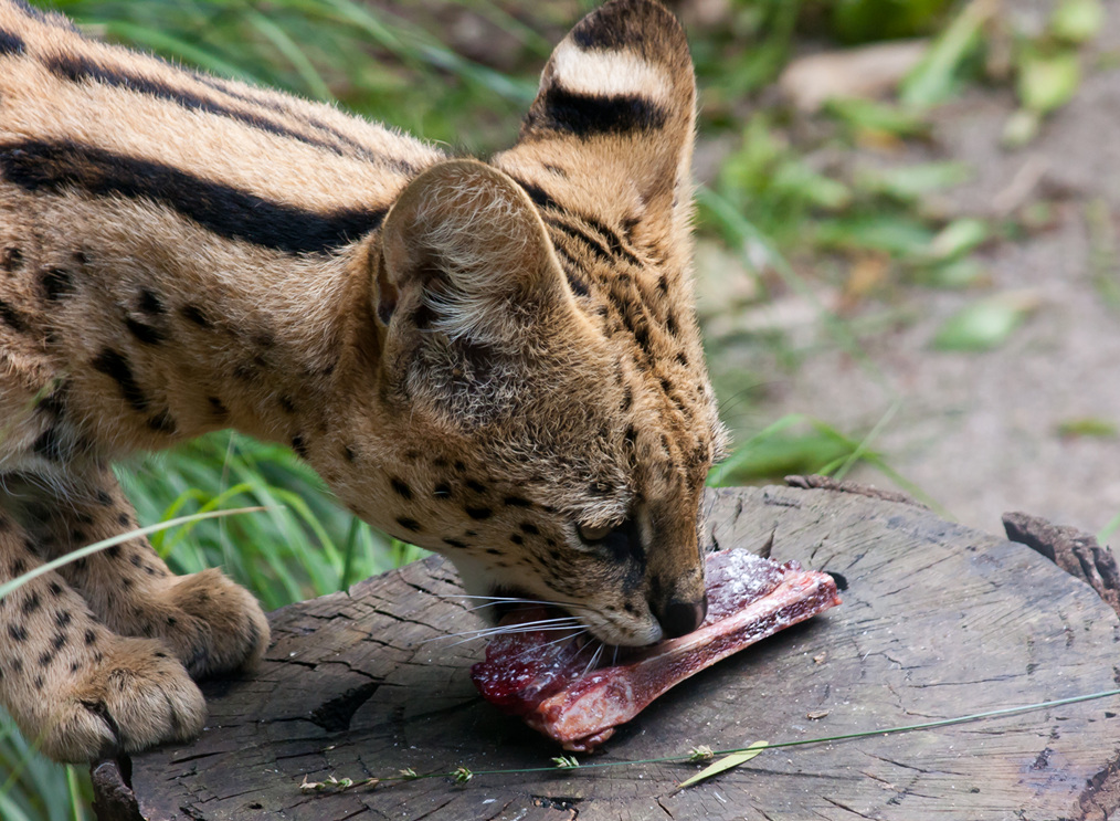 Содержание сервала — дорогое удовольствие. Придется удовлетворять потребность хищника в мясе. Взрослый кот в сутки съедает до 0,5 кг. Нужное животному меню включает: