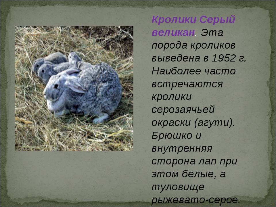 Данная порода была выведена в середине прошлого века и считается универсальной, так как обеспечивает большой выход мяса и шкурки хорошего качества. Вес взрослых кроликов обычно составляет от 4 до 7 кг, однако встречаются и более крупные особи. Туловище длинное – около 60 см, лапы мощные. Мех довольно густой, но по плотности уступает представителям специализированных шкурковых видов. Согласно стандарту, окрас шерсти у этих зверьков – серый, допускается наличие рыжего или «седого» оттенков.