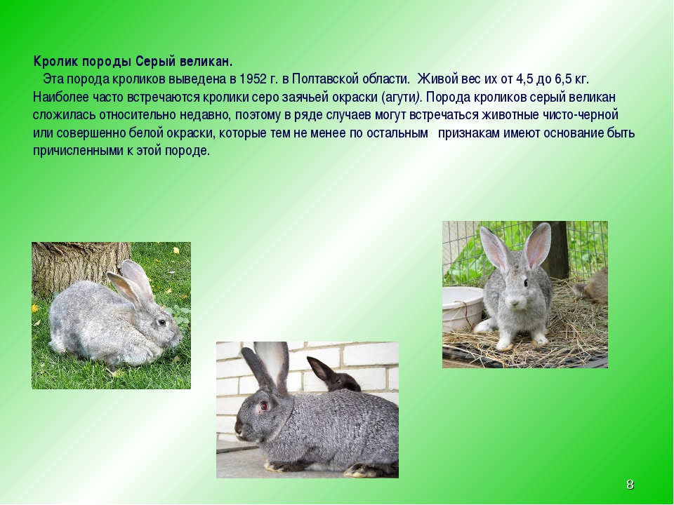 «Серый великан» также выведен для получения и меха, и мяса. Но сегодня его выращивают, как правило, в качестве мясного кролика. Средний вес этих животных – 5-7 кг. Цвет меха бывает серым, белым, черным.