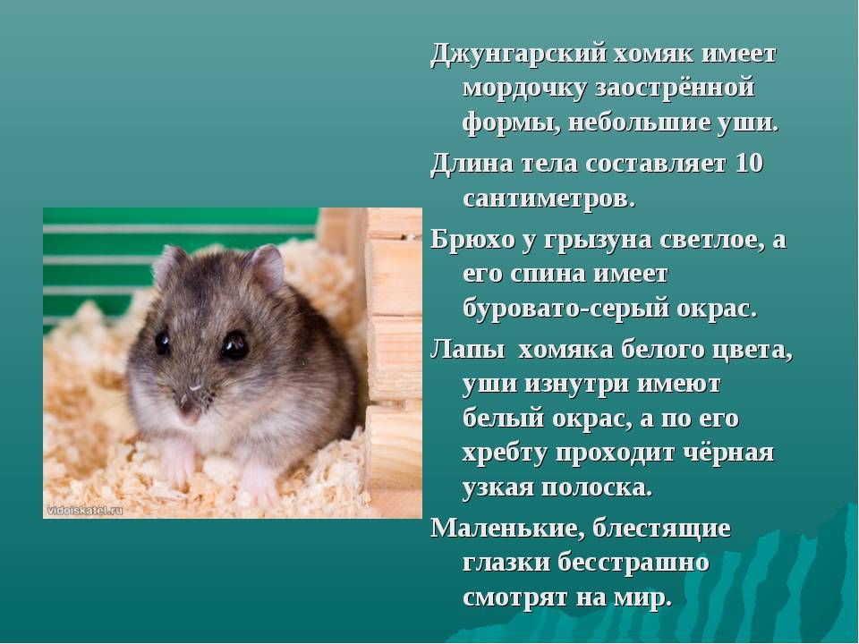 Джунгарики с черной полоской по хребту популярны и изучены лучше всех, спинка у них буровато-серого и охристо-серого окраса. Происходит данный вид из стран Азии и Западной Сибири, при хорошем уходе животные вырастают размером 10 см. Уход за джунгарскими хомяками в домашних условиях простой, содержат их в клетках на опилках, при ежедневной чистке гнезда запаха не слышно. Рекомендуется питомцев поселять парами, к размножению допускать с 3-х месячного возраста.