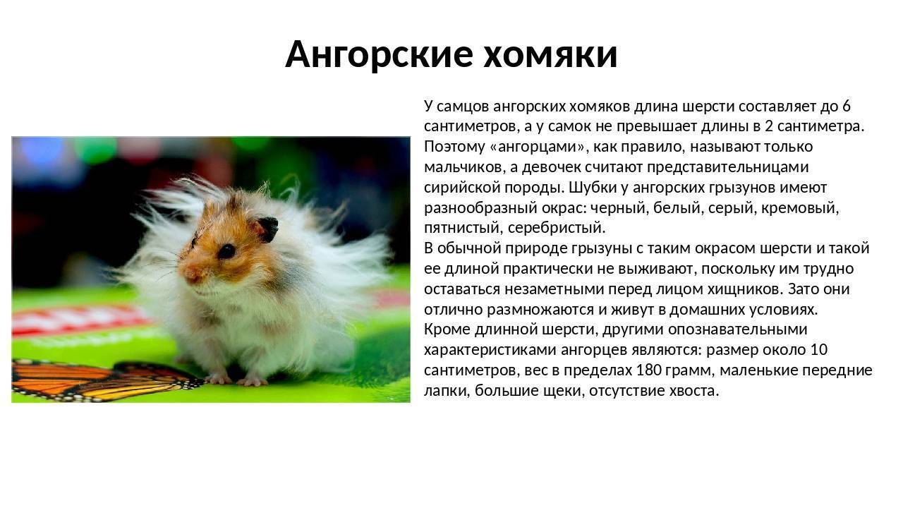 В природной среде отдельной породы ангорских хомяков нет, они являются своеобразной разновидностью распространенных сирийских хомяков, отличаясь от родственников неимоверно красивой пушистой шубой разного цвета. Не редкость, когда в пометах ангоров появляются малыши с гладкой и пышной шерстью. Цвет спинки у них встречается разнообразный – белый, серый, черепаховый, пятнистый, серебристый. Для данного хомяка дома уход требуется простой без сложных нюансов.