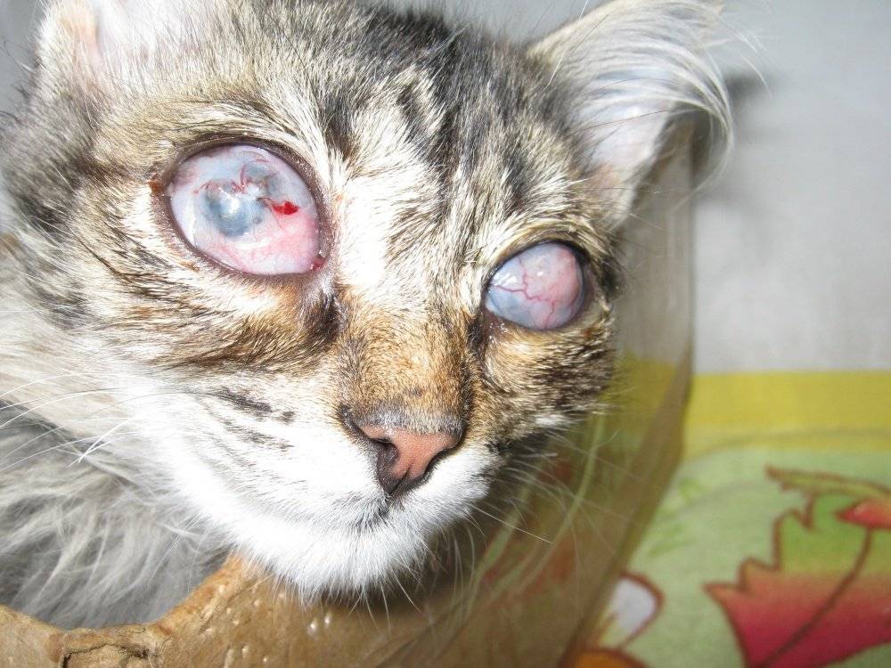 Хроническое течение вызывает глубокие поражения слизистой. Формируются язвенные дефекты или бельма на роговице, некроз кончика языка, поражается нервная система. Движения кошки становятся резкими, неловкими, появляется дрожь в лапках.