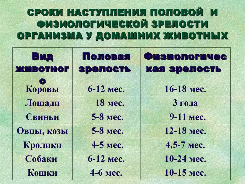 Первый период созревания у молодой самки случается в возрасте от шести месяцев до года. Досрочное или запоздалое наступление периода половой зрелости считается дефектом и поводом к выводу из разведения.