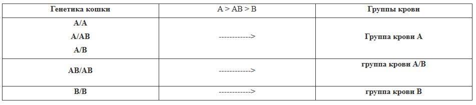 Комплект генов (генотип), достающийся животному при рождении, содержит набор из двух родительских аллелей, по одному от каждого. Если гены одинаковые – такой набор называется гомозиготным, если различные – гетерозиготным. В гетерозиготном наборе один из аллелей играет главную роль и называется доминантным. Для генов, ответственных за эритроциты, это аллель «А». Поэтому кошки с набором аллелей АА и Аb имеют группу крови А, являющуюся наиболее распространённой. Гены проявляют свою активность, разлагая эритроциты, отличающиеся по виду, поэтому при встрече двух различных красных кровяных телец антитела проявляют агрессию.