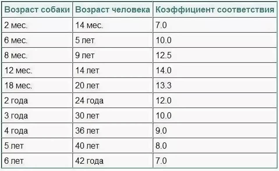 Обычно считается, что один год жизни собаки равен семи человеческим годам. Это ошибочное мнение. В разные периоды жизни этот коэффициент разный. Два месяца жизни собаки равны 14 человеческим месяцам. Но 6 месяцев равны 5 годам. 8 месяцев равны 9 годам и так далее. Возраст собаки в 1 год эквивалентен человеческому возрасту в 14 лет. Именно таким образом американский ученый Б. Фостер предложил расчет возраста собаки. Согласно его расчетам, 5-летнее животное эквивалентно 40-летнему человеку.