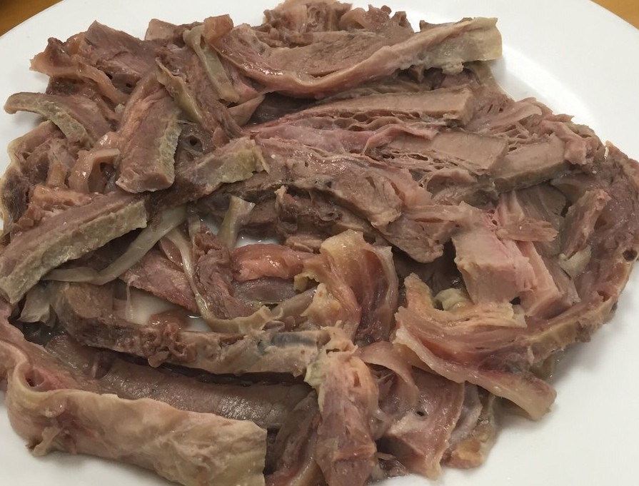 - Отварной субпродукт положите под пресс на 2 часа, чтобы из него вышла лишняя влага. Можно накрыть его тарелкой, сверху поставить банку с водой. Затем нарежьте субпродукт соломкой.