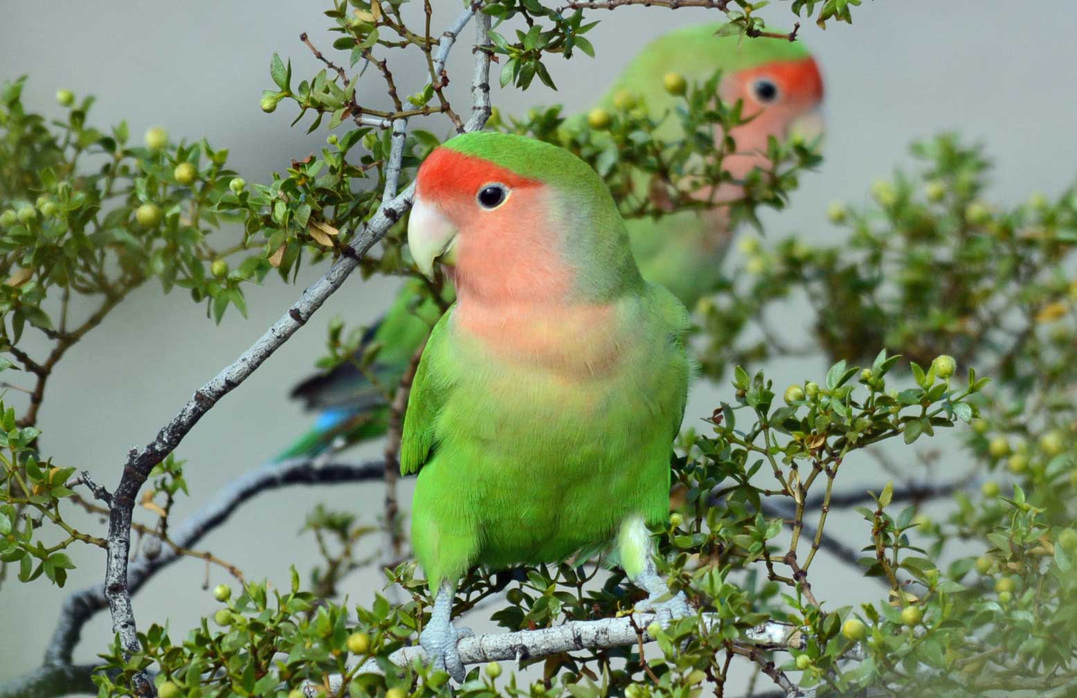 Но это скорее миф, просто надо какое-то время, прежде чем появится новая семья. Стаи относительно невелики, каждая включает несколько семейных пар. Очень часто попугаи неразлучники подтягиваются к фермам, которые предоставляют им пропитание. Птицы питаются семенами и ягодами.
