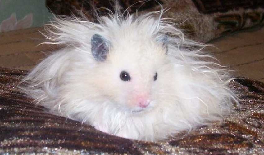 Породы ангорский хомяк не существует. Так часто называют сирийцев повышенной лохматости с длинной шерстью (достигает 10 см). Декоративная, знаменитая пушистостью, порода. Шерсть требует дополнительного ухода – учитывайте это, если соберетесь завести косматого хомячка.