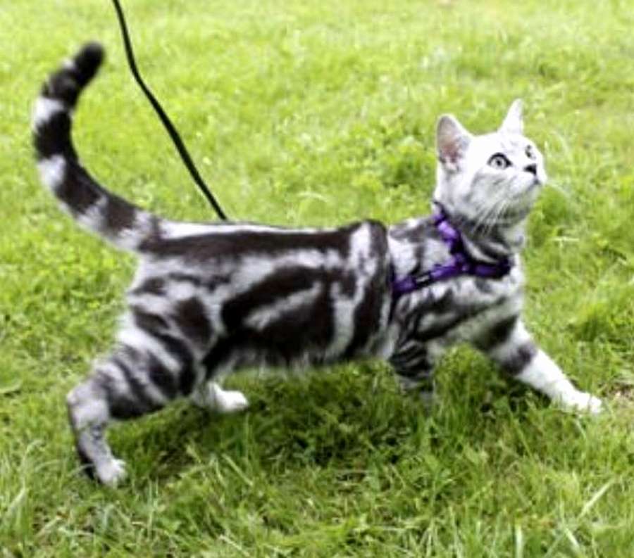 Молодой кот породы британский мраморный на шлейке с закрепленным на корпусе поводком. Шлейка также призвана обезопасить породистых производителей от случайных контактов.