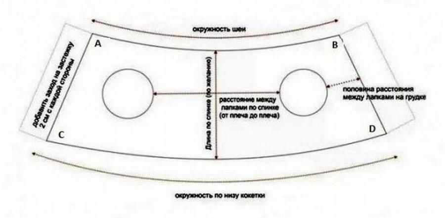 После этого необходимо снять мерки: обхват шеи, обхват грудной клетки за передними лапами в широком месте. Рассмотрим составление выкройки.