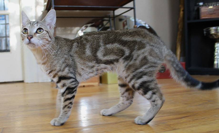 - Длинные и стройные лапы. Особенностью породы является то, что передние лапы короче задних. Кот ходит будто «на цыпочках».