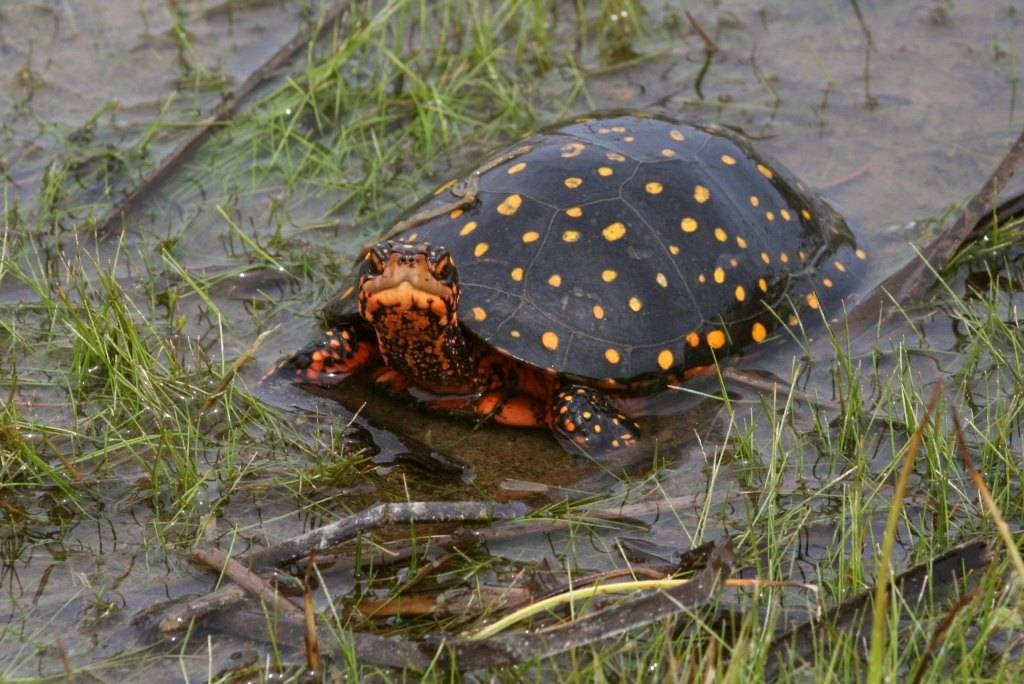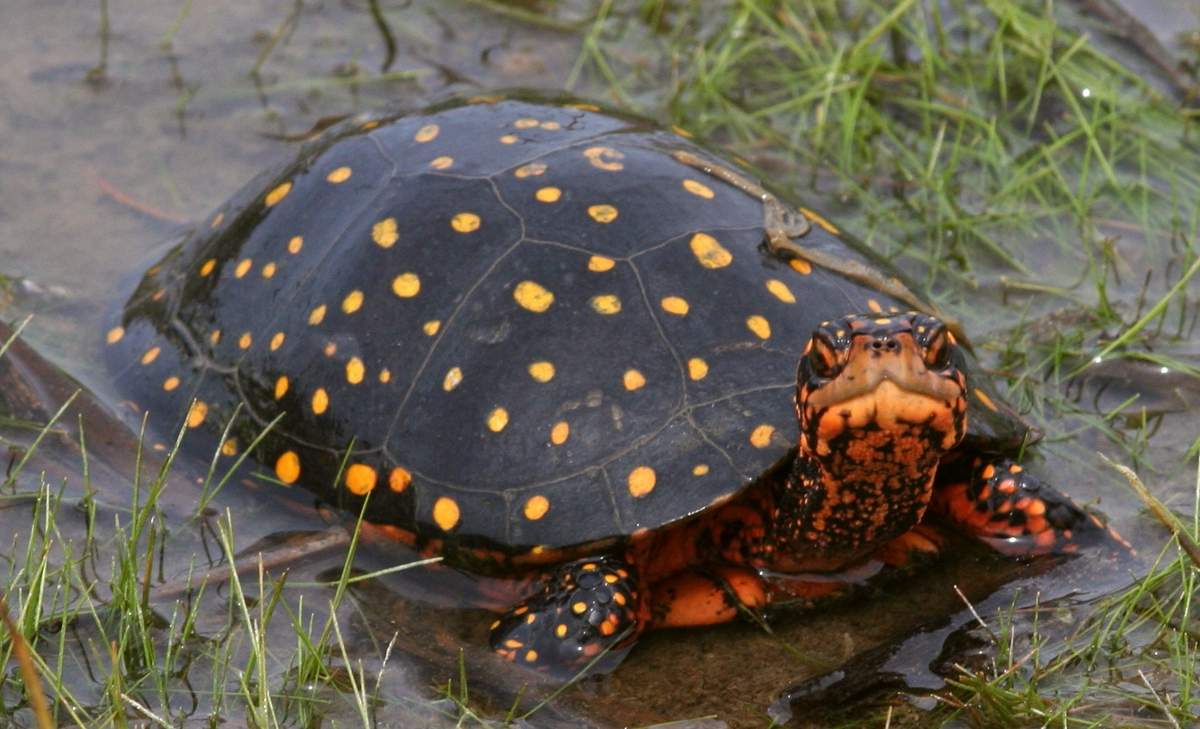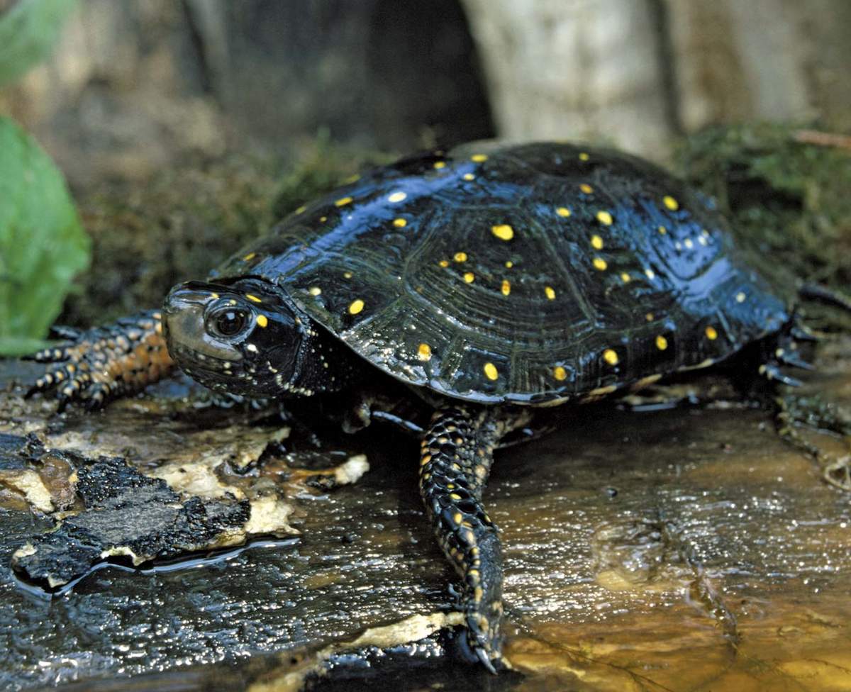 Полуводный вид. Черепаху невозможно перепутать с другой породой. Темный карапакас, шея, голова и лапы равномерно разбросаны светло-желтые пятна.