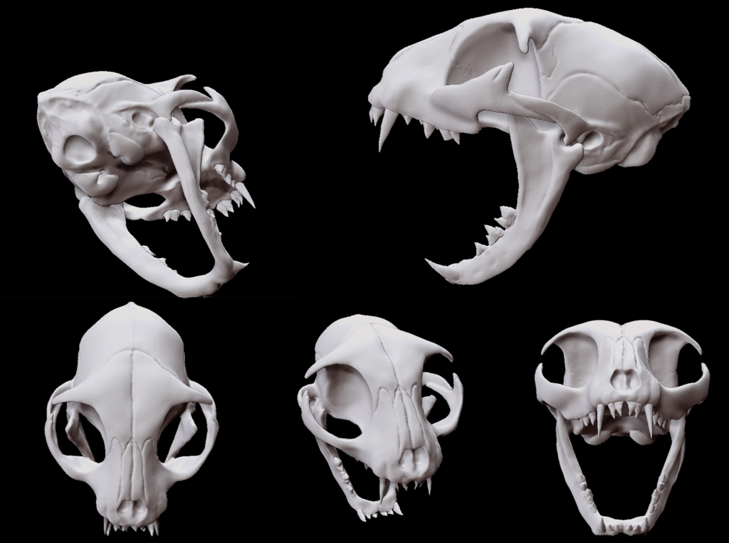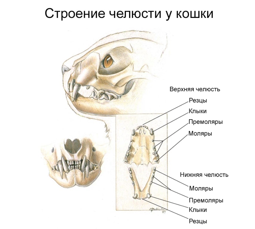 Характерные особенности кошачьего черепа – большие глазные впадины и узко расположенные клыки, предназначенные для охоты на некрупных животных. Мощная челюсть представителей данного семейства, имеющая прямой и клещеобразный прикус, оснащена разными типами зубов. Их количество у взрослой особи составляет 30 штук. У котят в 3–4-недельном возрасте уже вырастает 26 острых зубов. Полностью молочные единицы меняются на коренные в 5–6 месяцев.
