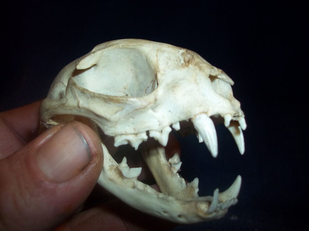 Характерные особенности кошачьего черепа – большие глазные впадины и узко расположенные клыки, предназначенные для охоты на некрупных животных. Мощная челюсть представителей данного семейства, имеющая прямой и клещеобразный прикус, оснащена разными типами зубов. Их количество у взрослой особи составляет 30 штук. У котят в 3–4-недельном возрасте уже вырастает 26 острых зубов. Полностью молочные единицы меняются на коренные в 5–6 месяцев.