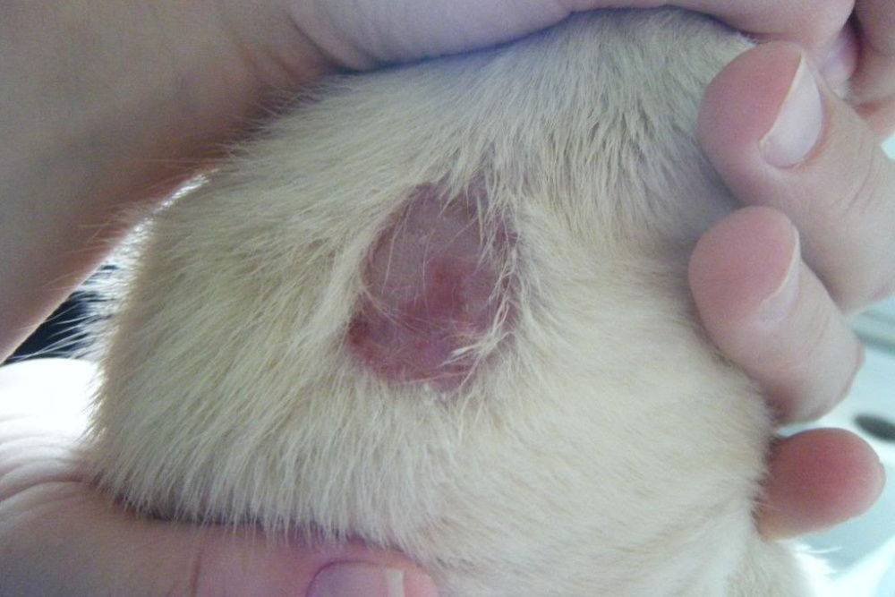 - Стригущий лишай. Болячки при нем имеют характерный внешний вид. Это не сыпь, не узелки, а пятна с оголенной кожей розового цвета, со временем покрывающиеся бурыми сухими корками. Они со временем отпадают, когда животное расчесывает болячку. В итоге рана становится мокрой, нередко кровоточащей, и очень докучает питомцу. Стригущему лишаю свойственно быстро распространяться и захватывать все большие участки тела несчастного животного. Другое его название – дерматофитоз (дерматофиты – грибы, вызывающие болезнь).