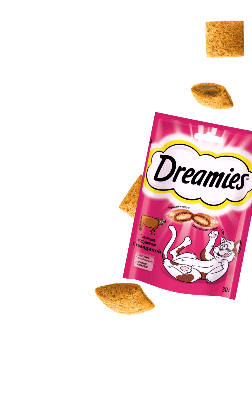 Не забывайте о том, что ваша любимица нуждается в положительных эмоциях, поэтому давайте ей лакомства. Например, в DREAMIES есть множество вкусов, которые особенно нравятся кошкам. Питомцу, который неравнодушен к сырому мясу, бывает сложно угодить. Но если вы угостите его лакомством DREAMIES с говядиной, он останется доволен. Хрустящие подушечки с нежной начинкой доставят ему истинное удовольствие.