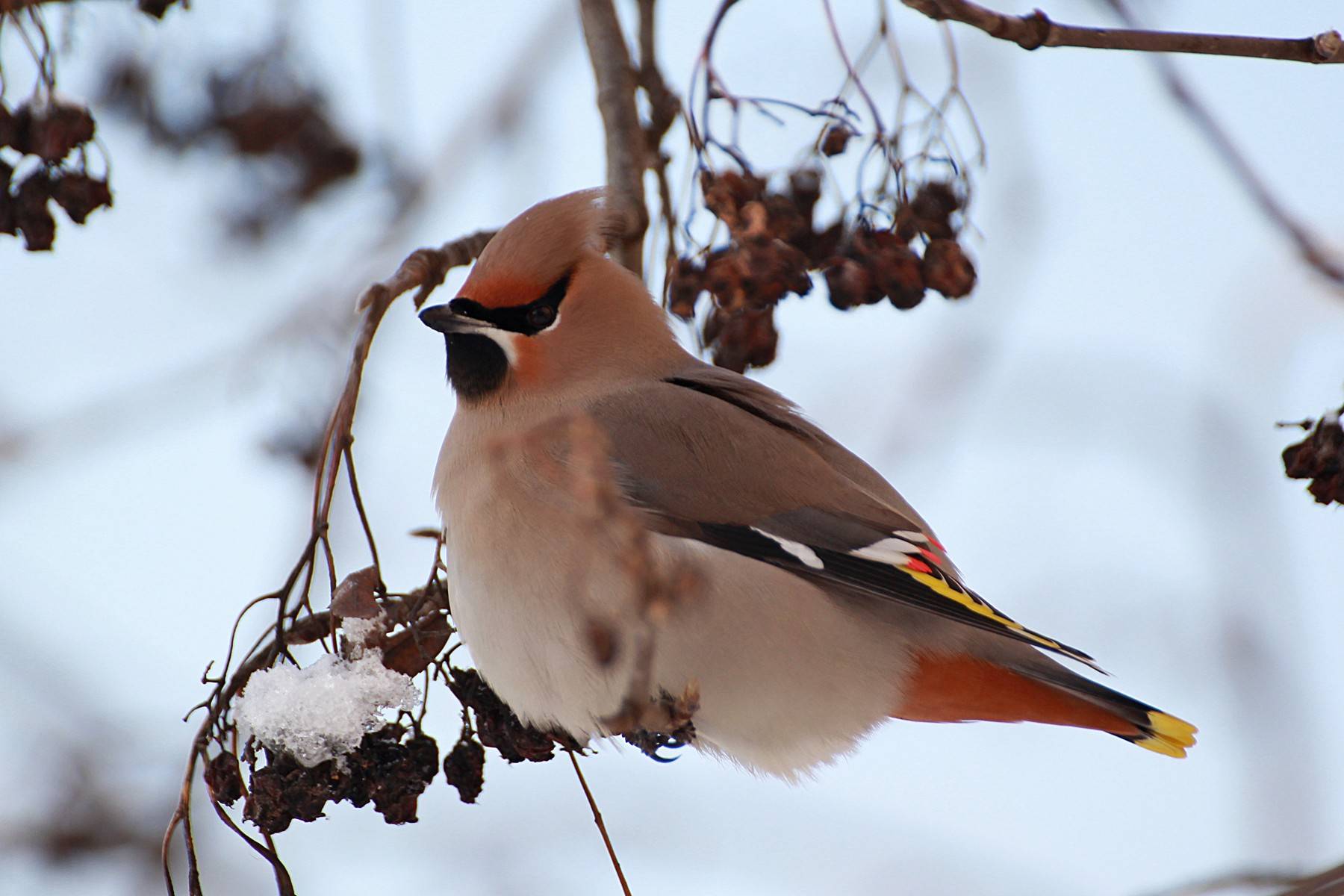 - В зимний период свиристель, как и многие другие виды птиц, вынуждена менять рацион: в это время кормом для птицы становятся плоды рябины, боярышника, шиповника. Пернатые обычно проглатывают их целиком, и плоды не всегда успевают переварится в желудке.