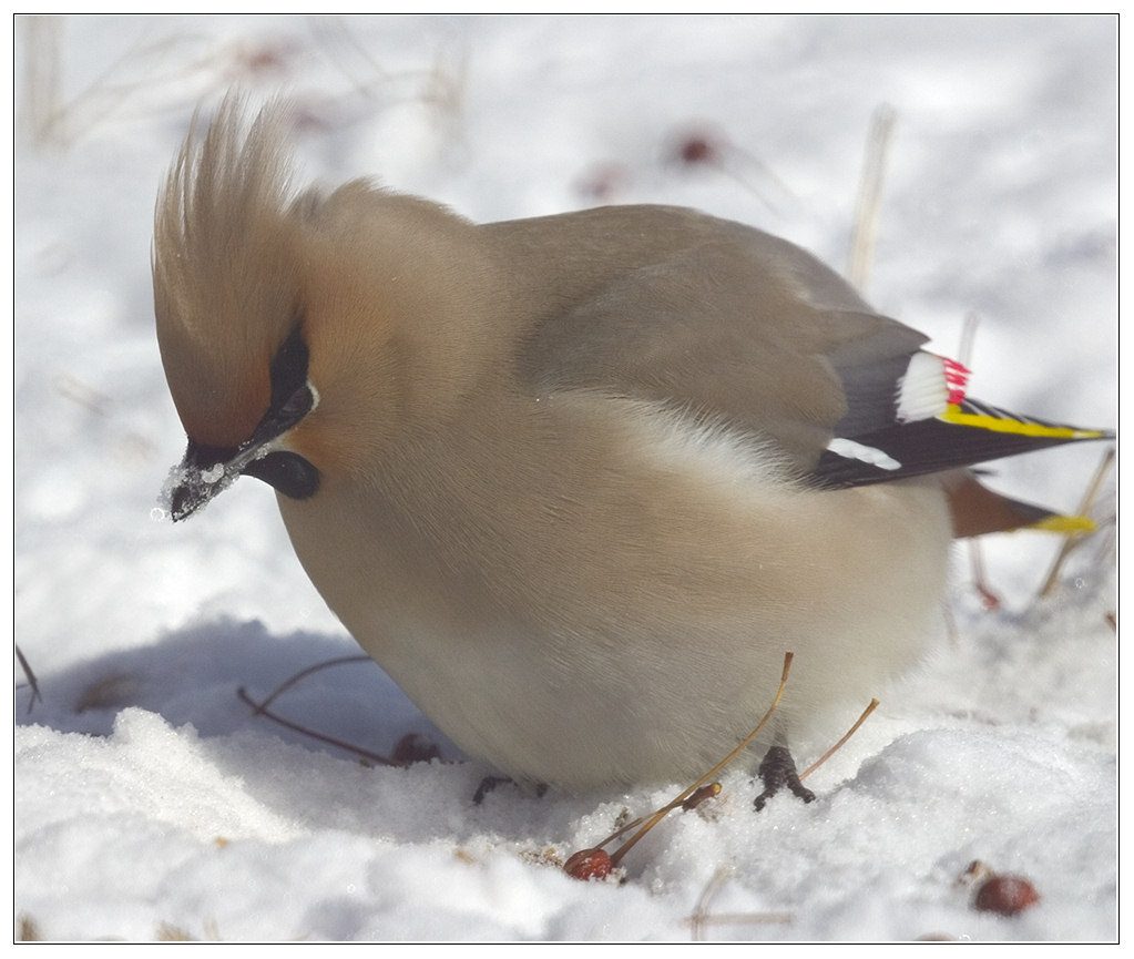 Кстати, узнать, что появились свиристели, очень просто. Нужно внимательно рассмотреть снег под кустами. Если на снегу появились красные пятнышка ягод, или же на снегу можно найти расклёванные семена, которые свиристели так и не смогли переварить, то это значит, что птица находится в ваших краях.