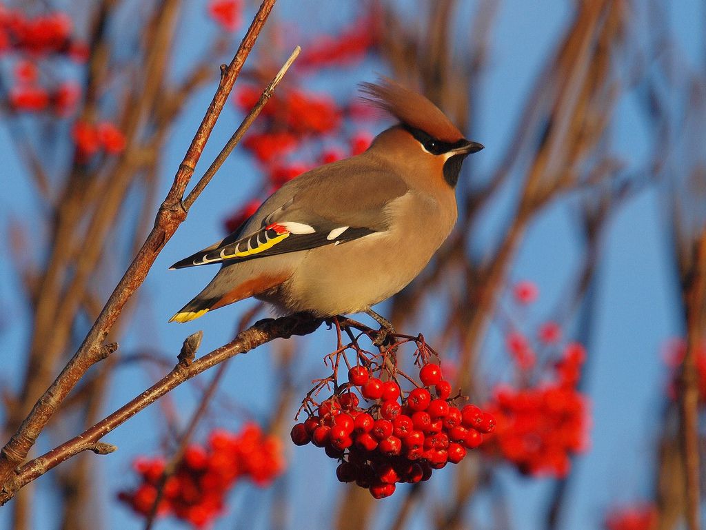 Что за птица свиристель? Начинать знакомство с ярким представителем отряда воробьиных лучше зимой, когда на фоне снега и алых гроздьев рябины мелькают красиво окрашенные юркие птички с хорошо заметным хохолком.