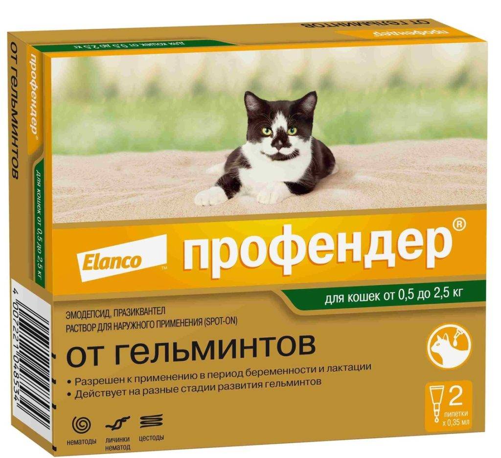 Профендер. Это препарат направленного действия, уничтожающий исключительно гельминтов (цестод и нематод). В его составе два активных компонента: празиквантел и эмодепсид