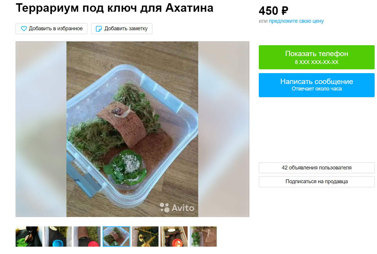 Пример объявления на Авито: делают террариумы для ахатин под ключ до 500р.
