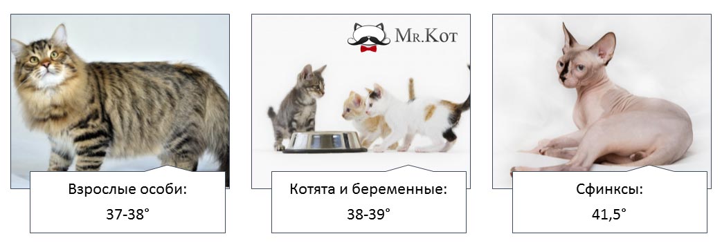 Нормой для котов следует считать температуру тела 38-39 °С, а для котят данный показатель немного выше. Также на этот показатель влияет и время года. В летний сезон она выше нормы. Для котов породы сфинкс базовая температура составляет 40-41 °C.