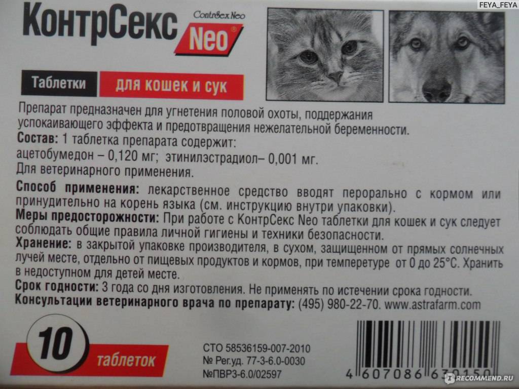 - Контрасекс в каплях, таблетках. Для предотвращения наступления нежелательной беременности. Относится к высокогормональным ветпрепаратам.
