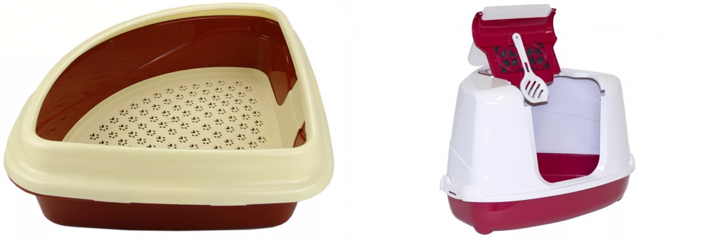- Разновидность туалета. В этом случае следует ориентироваться на поведение кошки. Если она разбрасывает наполнитель или ходит мимо лотка, то лучше всего остановить выбор на конструкции с высокими бортиками. Для стеснительных животных подойдет закрытый туалет. Котенку рекомендуется подобрать открытый лоток с низкими бортиками.