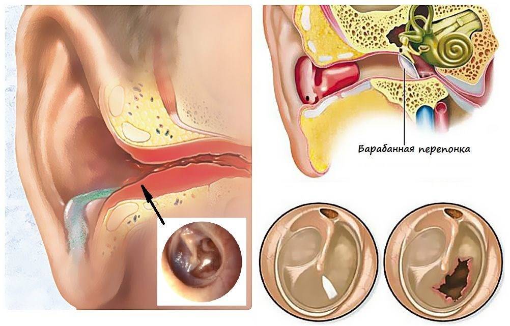 - Перелом основания черепа, при котором происходит разрыв барабанной перепонки, из уха вытекают кровь и спинномозговая жидкость, нарушается слух и вестибулярная функция.