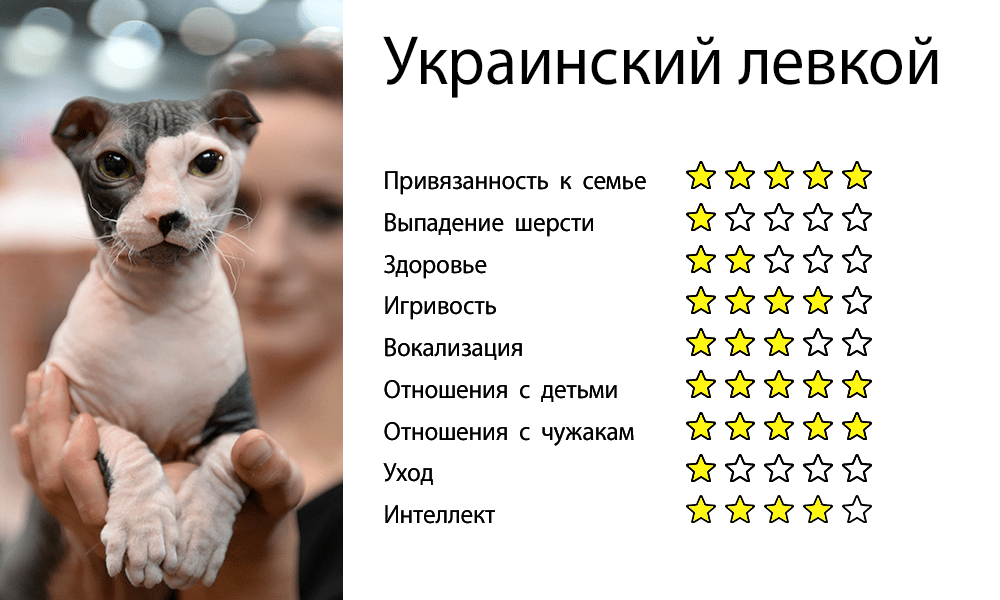 В заключение описание украинского левкоя дополняют еще два пункта — интеллект и уживчивость. Как можно видеть в таблице — котенок не конфликтует и легко находит общий язык практически с любыми другими домашними животными. У него нет агрессии, а за счет высокого уровня интеллекта он легко и быстро подружится с остальными обитателями вашего дома.