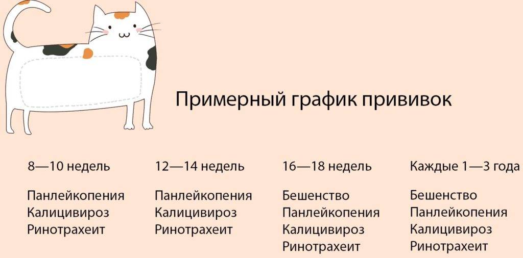 Для удобства составлен специальный график вакцинации с указанием: болезни, времени первой прививки котенку, повтор (ревакцинация), первая прививка не вакцинированной взрослой кошке, повтор. Каждая болезнь отличается временем введения, количеством уколов, перерывом между прививками.