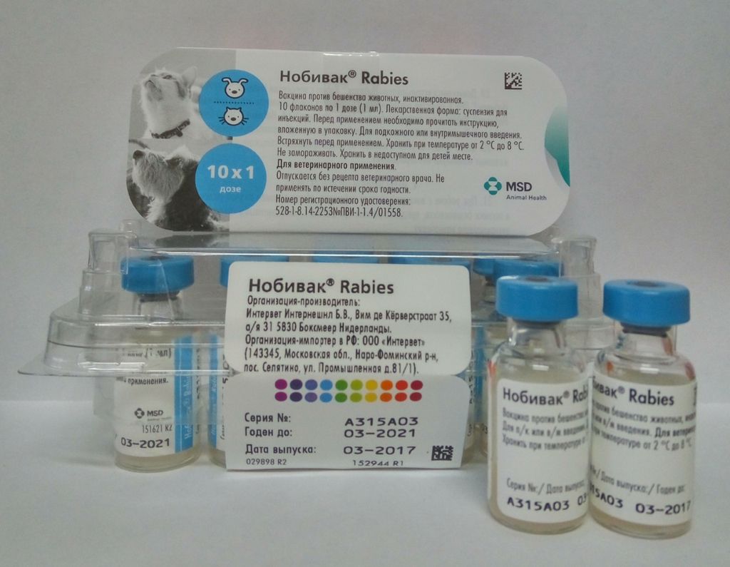 - Nobivac Rabies. Голландский препарат против бешенства с пролонгированным действием. Ревакцинация проводится спустя 3 года.