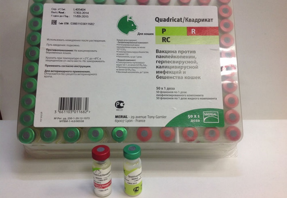 - Квадрикат. Производитель – французская фирма «Merial». Действует против кальцивироза, вируса герпеса, бешенства и панлейкопении.