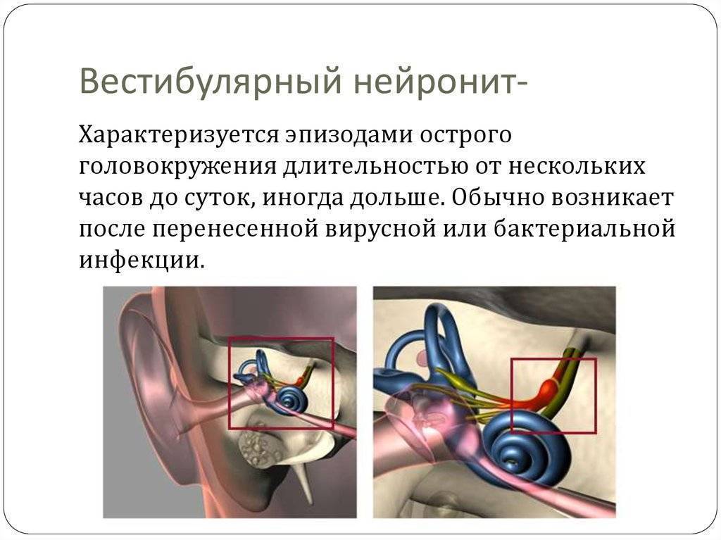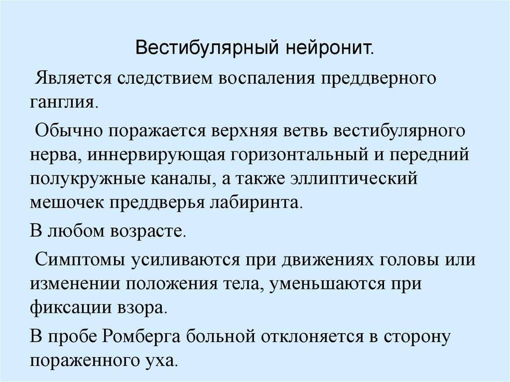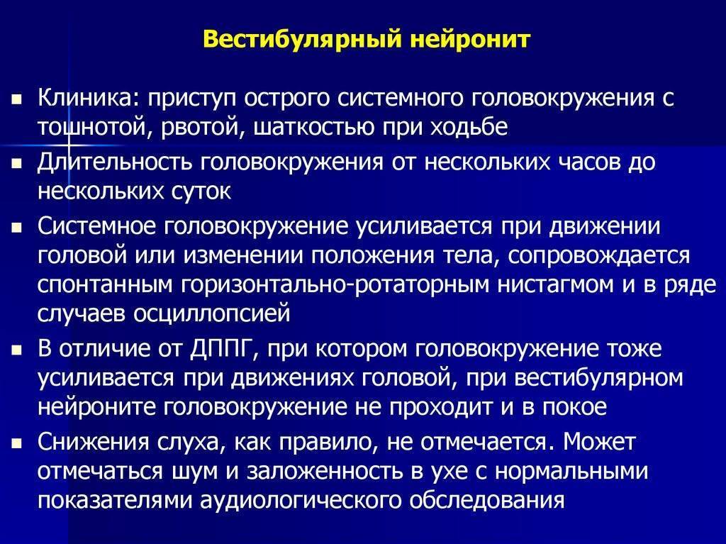 Вестибулярный нейронит манифестирует остро и протекает приступообразно, обычно в виде однократного эпизода, изредка с отдаленными по времени рецидивами. В большинстве случаев атака острой периферической вестибулопатии разрешается спонтанно в течение нескольких дней, оставляя резидуальную симптоматику, которая также постепенно затухает за несколько недель. Известно, однако, что у лиц пожилого и старческого возраста период реконвалесценции (полного выздоровления) нередко затягивается на месяцы.
