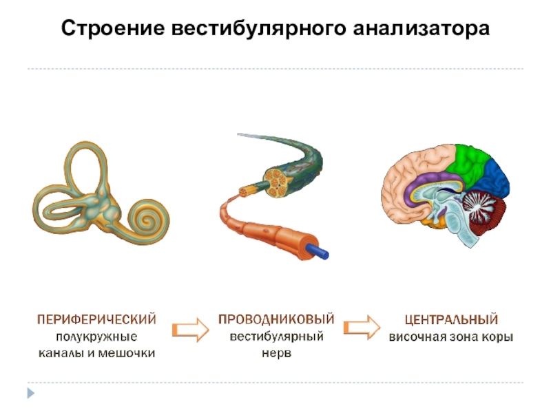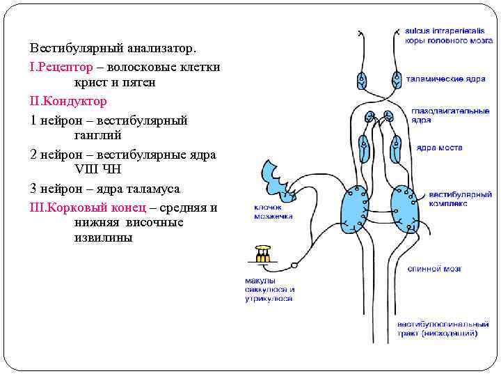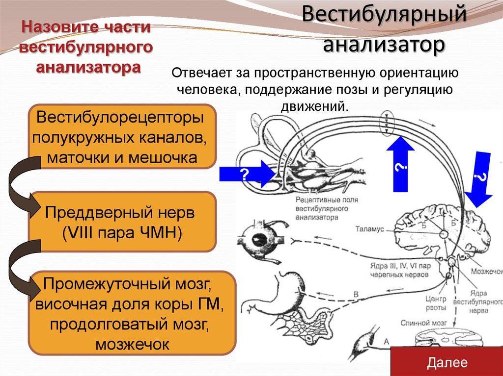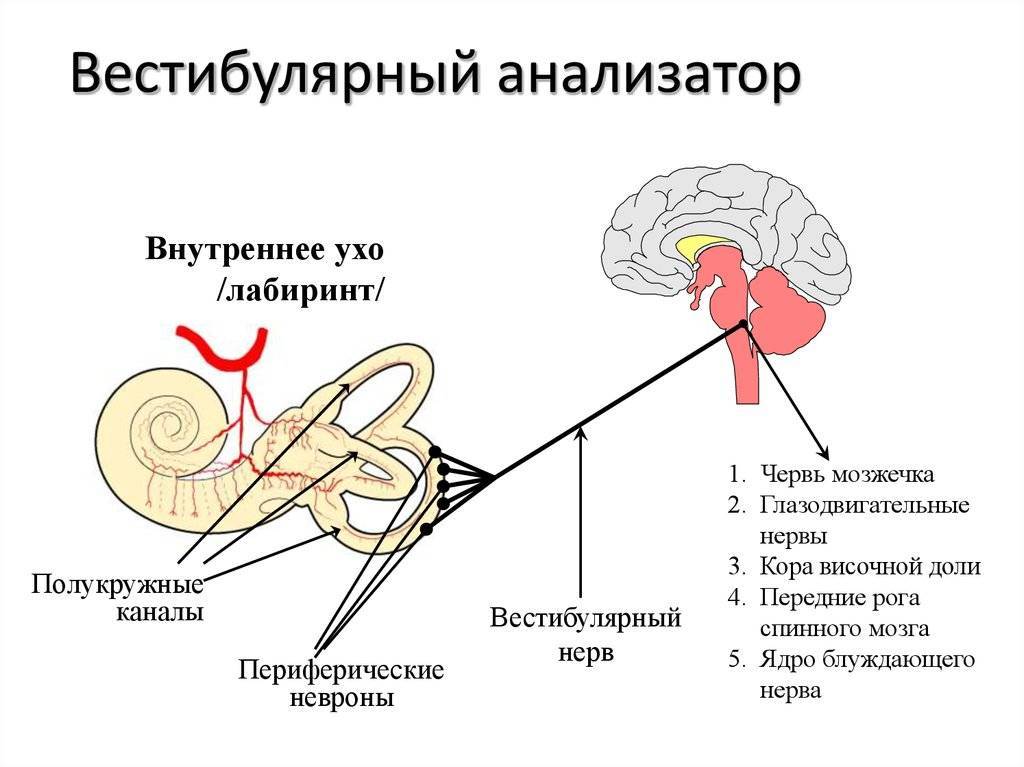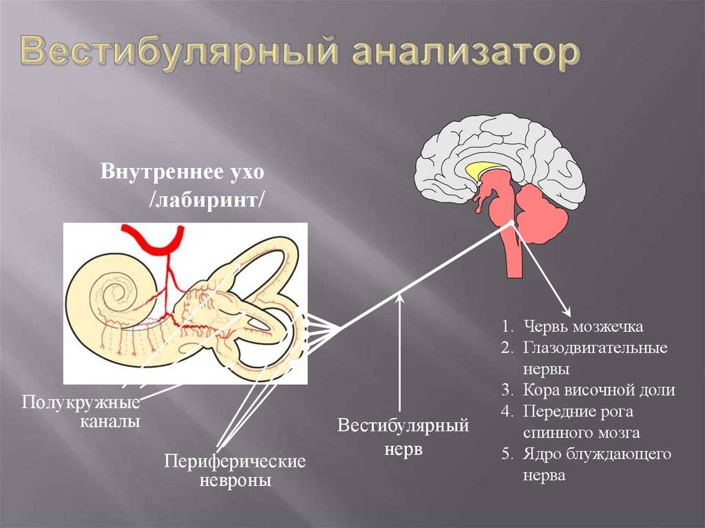Нервная система собирает информацию, которая поступает от зрительного аппарата, тактильных рецепторов и других органов чувств, а также от внутреннего уха, а затем происходит ее анализ. Центр равновесия расположен в коре головного мозга, а именно в ее височном отделе. По нервам импульсы достигают вестибулярных ядер — скоплений нервных клеток, способных воспринимать, анализировать и согласовывать информацию, полученную из разных областей.