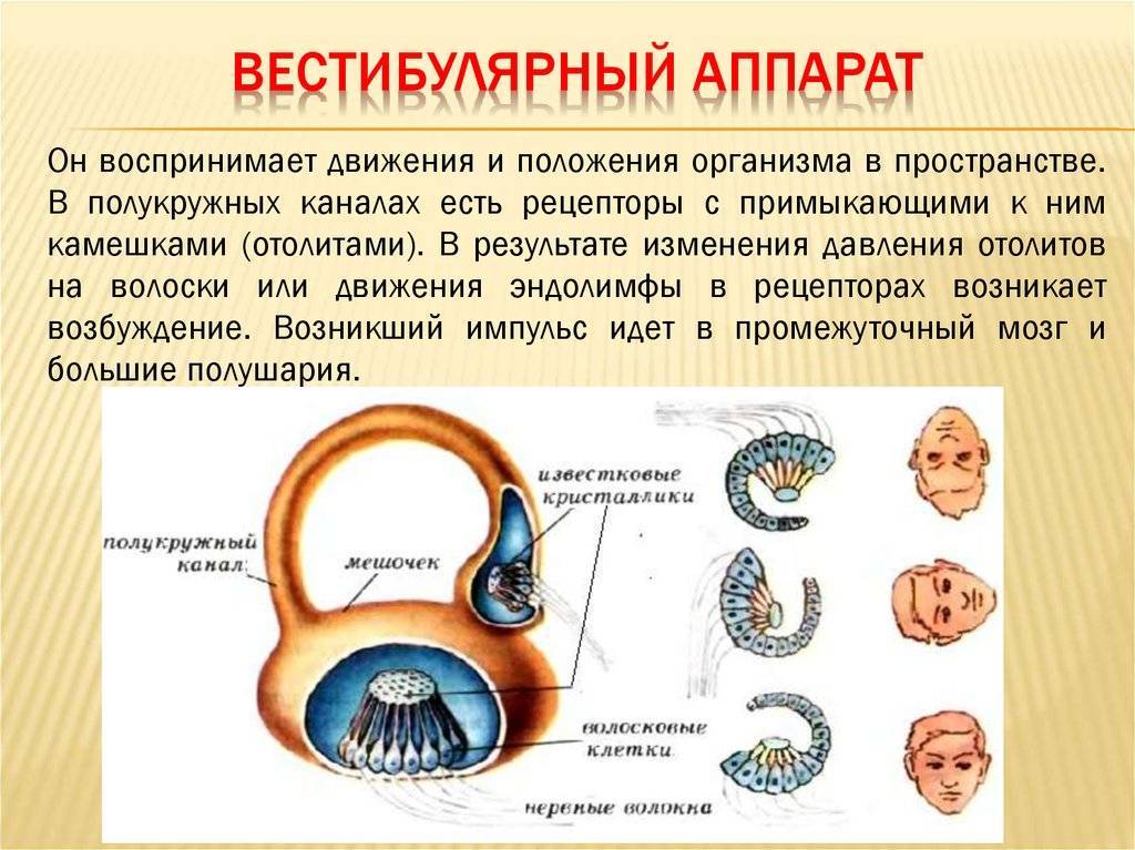 Внутреннее ухо — это орган, который отвечает за способность человека удерживать равновесие. Он имеет сложное строение и состоит из нескольких отделов: преддверия, 3-х полукружных каналов и улитки. Внутреннее ухо защищено костной тканью, которая формирует височную долю черепа. Оно заполнено водянистой жидкостью — она движется при наклонах и поворотах головы человека, и эта информация воспринимается чувствительными клетками для идентификации положения тела в пространстве.