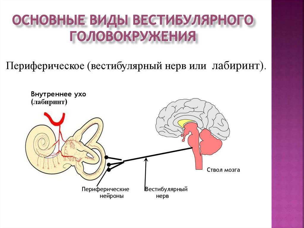 - периферическое — при нарушении проведения импульса на уровне вестибулярного нерва либо внутреннего уха (органа равновесия);