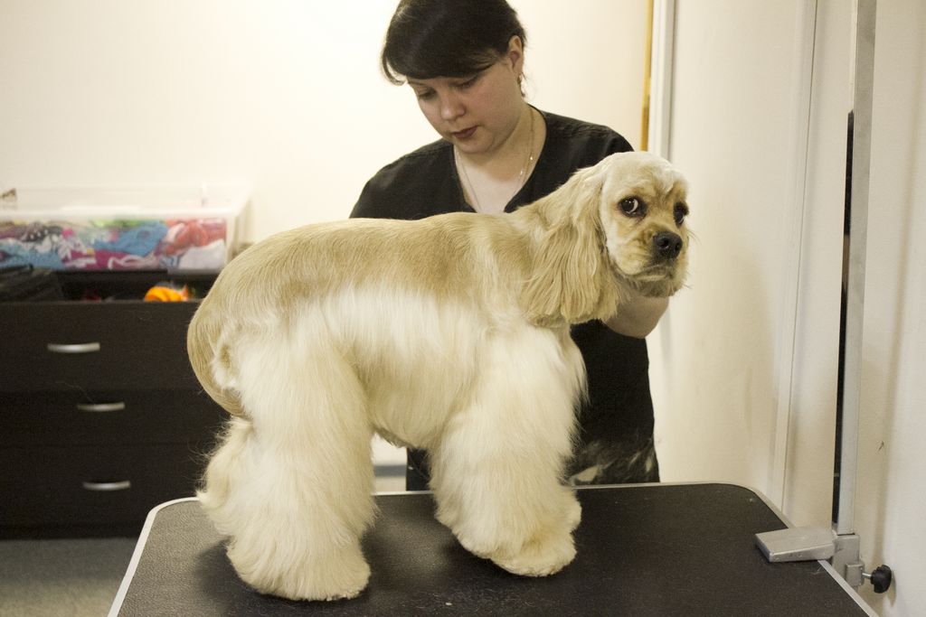 Первая стрижка американского кокер-спаниеля должна приходиться на 2-месячный возраст собаки. После этого полный груминг производится раз в квартал, гигиеническое подравнивание контуров выполняется каждые 14-21 день. При стрижке формируется выпуклая, выдающаяся вперед грудь, пышная нижняя юбка. На шее спереди, щеках, губах, подбородке собаки, черепе, в верхней части ушей длина шерсти состригается машинкой до 1 мм.