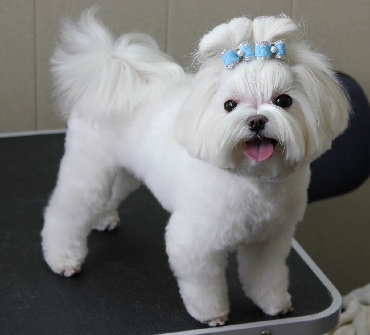 Мальтезе одна из немногих пород собак, чей шёрстный покров позволяет создавать оригинальные стрижки и причёски. Обычно выставочная болонка обращается в салон 2-3 раза в месяц, собака, которая на выставки не ходит, может это делать намного реже — от 6 до 8 раз в год.