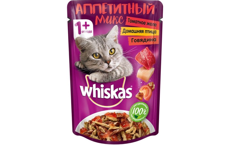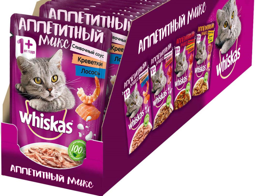 Эта продукция предназначена для питания взрослых животных. Корм является полнорационным, он содержит все важные для животных компоненты, поэтому может использоваться каждый день. «Аппетитный микс» – это влажный корм, который принципиально отличается от других продуктов Whiskas. В его состав входят три основных вкусообразующих ингредиента: