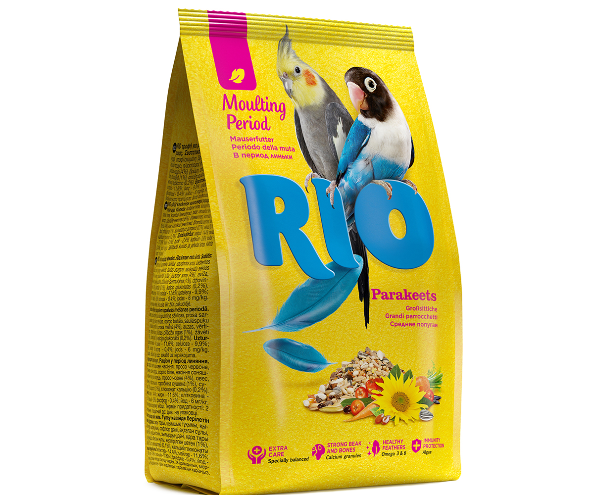 Обогащенное меню от Rio специально производится для времени смены перьев. Продукт подходит для мелких и средних особей, для каждой породы существует отдельная линейка.