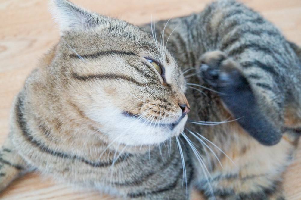 кошка активно вылизывает шерсть, зубами выкусывает паразитов;