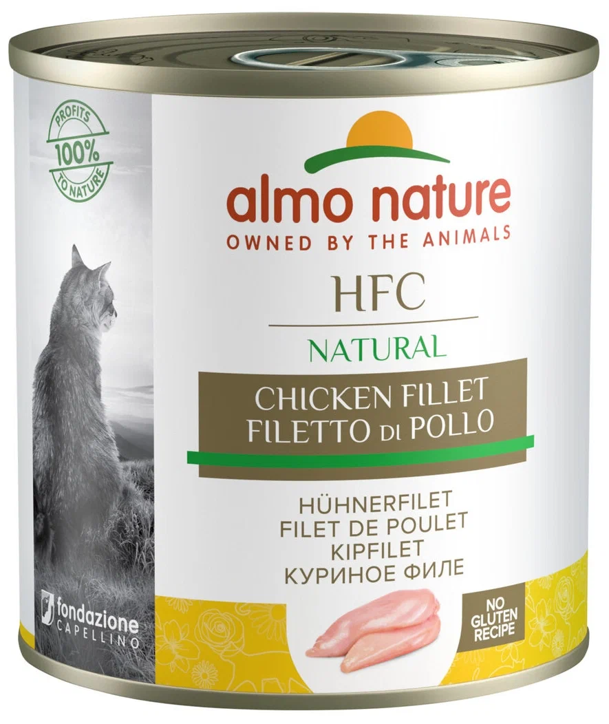 Продолжает рейтинг лучших влажных кормов класса Холистик для кошек Almo Nature HFC Natural в формате куриного филе. Он выпускается в жестяных банках весом по 280 грамм, и этого хватает на 3-4 раза кормления. Рекомендуемая возрастная категория — питомцы 1-6 лет. Содержание белка приравнивается к 20%, жира же всего 0,5%, вот почему продукт считается низкокалорийным и диетическим. Уровень влажности не превышает 78%. Ингредиентов в составе немного — филе курицы (75%), куриный бульон (24%) и рис (1%). Злаки также прописаны на упаковке, только производитель не уточняет, какие именно.