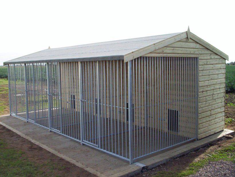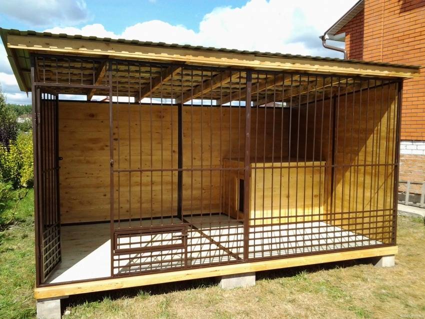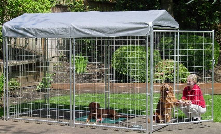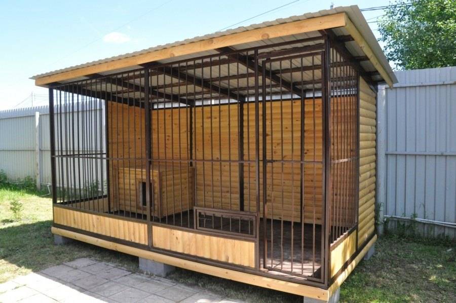 Дверь делается из уголков, которые свариваются в виде четырёхугольника, она обшивается фанерой, жестью, металлическим листом или досками. Каждая порода собак имеет свой темперамент, например, для флегматичных крупных мастиффов достаточно будет пространства 12–14 метров. Для более подвижных и энергичных (хаски или немецкая овчарка) потребуется не менее 17 квадратных метров.