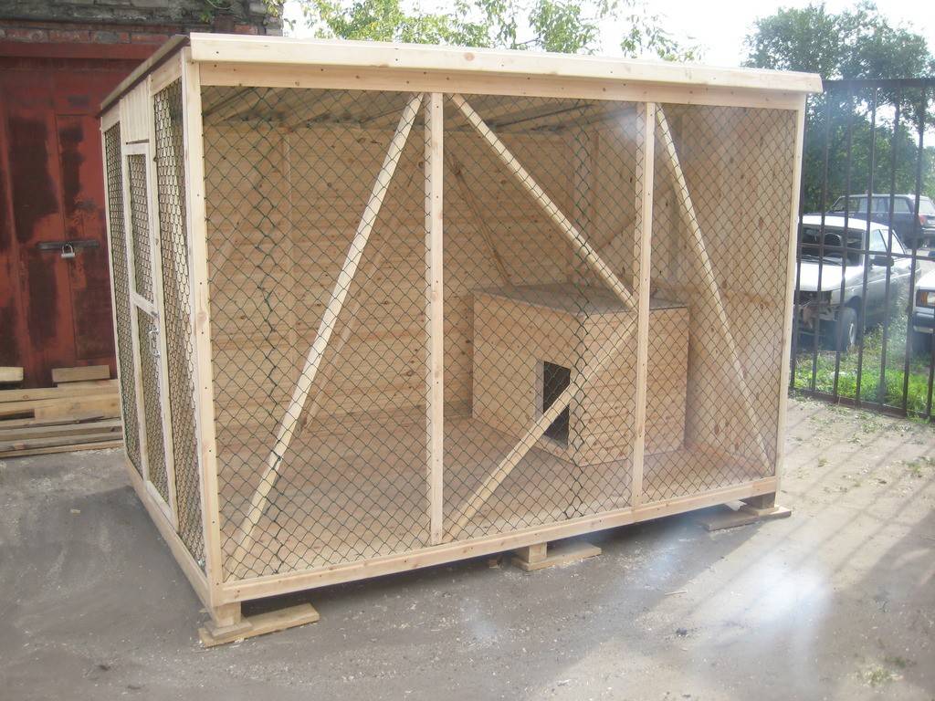 Стены могут быть возведены из кирпича, пеноблоков, пенобетона, досок или фанеры. Вольеры имеет обычно три основательных глухих стены, а четвёртая затягивается сеткой (иногда это пространство закрывается решетчатой конструкцией). Пол настилается из досок, они обрабатываются праймером; изнутри материал покрывается гидроизоляцией. Кровля может быть односкатной или двухскатной, используется материал: